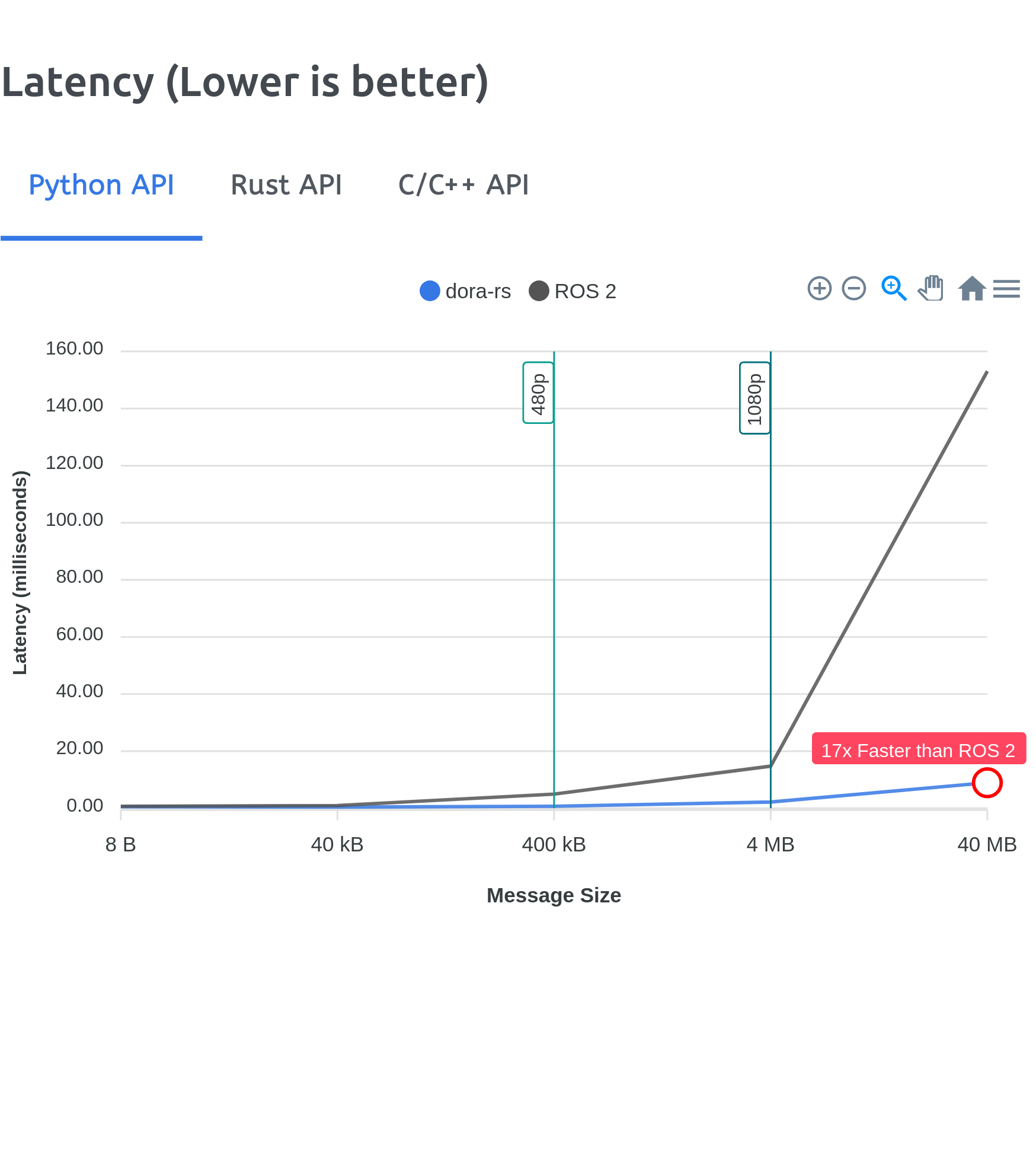 | dora-rs can show impressive performance, up to 17x faster compared to current status quo ROS2 in Python! This is the result of using our own shared memory server and Apache Arrow to achieve zero copy data passing. | |||