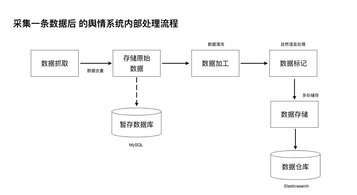 储存加工好的数据、去掉样式的原文信息,以及打上各种标签的数据,储存在分布式搜索中,这样便于用户对数据的检索。