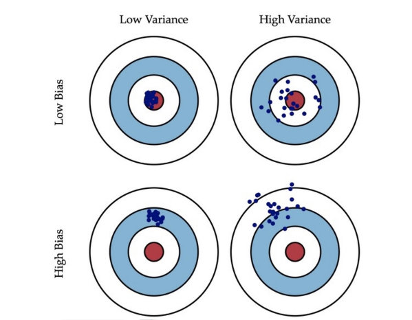 我们应尽量使得拟合模型处于低方差(较好地拟合数据)状态且同时处于低偏差(较好地预测新值)的状态。
