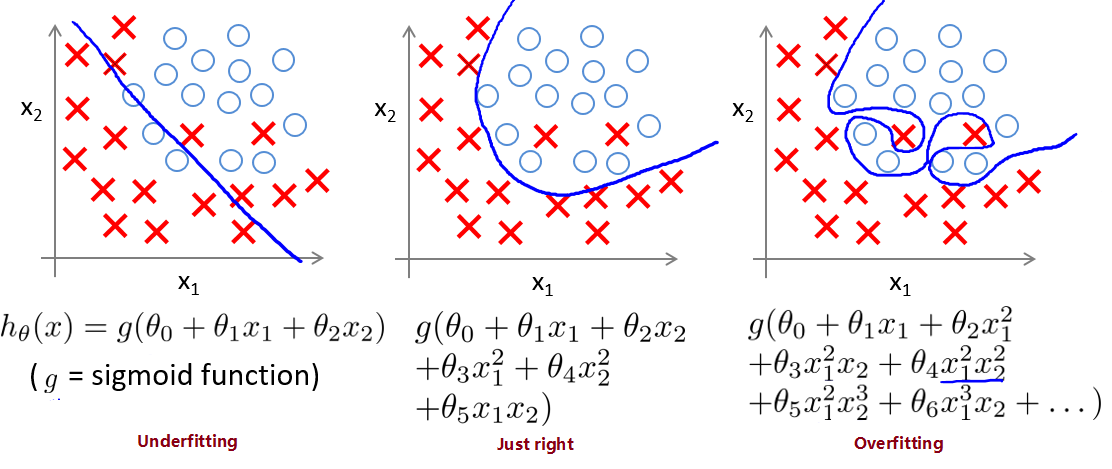 据上图,高偏差意味着欠拟合,高方差意味着过拟合。