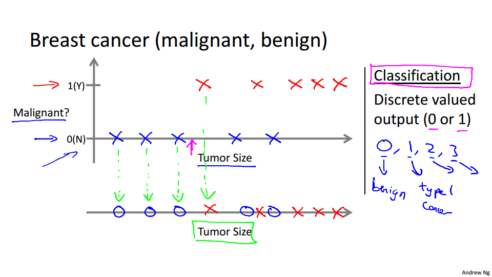 视频中举了癌症肿瘤这个例子,针对诊断结果,分别分类为良性或恶性。还例如垃圾邮件分类问题,也同样属于监督学习中的分类问题。