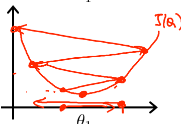 把红点定为初始点,切于初始点的红色直线的斜率,表示了函数 $J\left(\theta\right)$ 在初始点处有正斜率,也就是说它有正导数,则根据梯度下降公式 ,${{\theta }{j}}:={{\theta }{j}}-\alpha \frac{\partial }{\partial {{\theta }_{j}}}J\left( \theta_0, \theta_1 \right)$ 右边的结果是一个正值,即 $\theta_1$ 会向左边移动。这样不断重复,直到收敛(达到局部最小值,即斜率为0)。