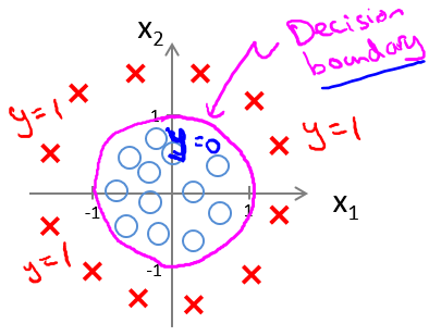 这里取 $\theta = \begin{bmatrix} -1\0\0\1\1\end{bmatrix}$,决策边界对应了一个在原点处的单位圆(${x_1}^2+{x_2}^2 = 1$),如此便可给出分类结果,如图中品红色曲线: