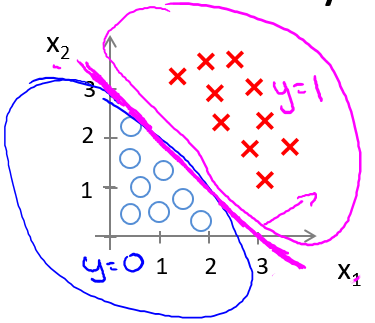 如果取 $\theta = \begin{bmatrix} -3\1\1\end{bmatrix}$,则有 $z = -3+{x_1}+{x_2}$,当 $z \geq 0$ 即 ${x_1}+{x_2} \geq 3$ 时,易绘制图中的品红色直线即决策边界,为正向类(以红叉标注的数据)给出 $y=1$ 的分类预测结果。