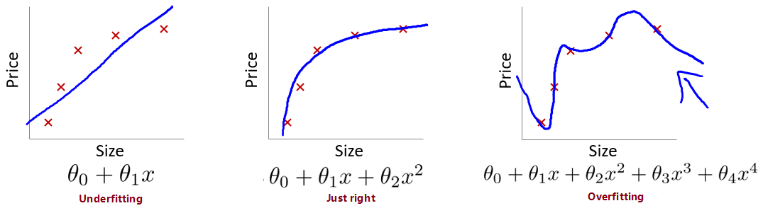 上式中,我们在代价函数中增加了 $\theta_3$、$\theta_4$ 的惩罚项(penalty term) $1000\cdot\theta_3^2 + 1000\cdot\theta_4^2$,如果要最小化代价函数,那么势必需要极大地减小 $\theta_3$、$\theta_4$,从而使得假设函数中的 $\theta_3x^3$、$\theta_4x^4$ 这两项的参数非常小,就相当于没有了,假设函数也就**“变得”简单**了,从而在保留各参数的情况下避免了过拟合问题。