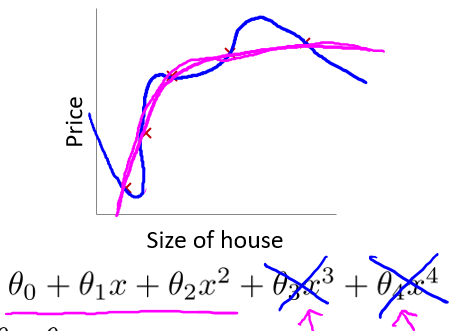 上文中,$\theta_0 + \theta_1x + \theta_2x^2 + \theta_3x^3 + \theta_4x^4$ 这样一个复杂的多项式较易过拟合,在不减少特征的情况下,如果能消除类似于 $\theta_3x^3$、$\theta_4x^4$ 等复杂部分,那复杂函数就变得简单了。