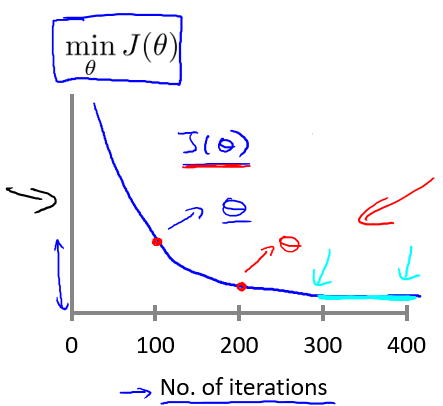 对于梯度下降,一般采用多次迭代收敛法来得出最小化代价函数的参数值,自动化测试收敛法(如设定 $J\left(\theta\right) < {10}^{-3}$ 时判定收敛)则几乎不会被使用。