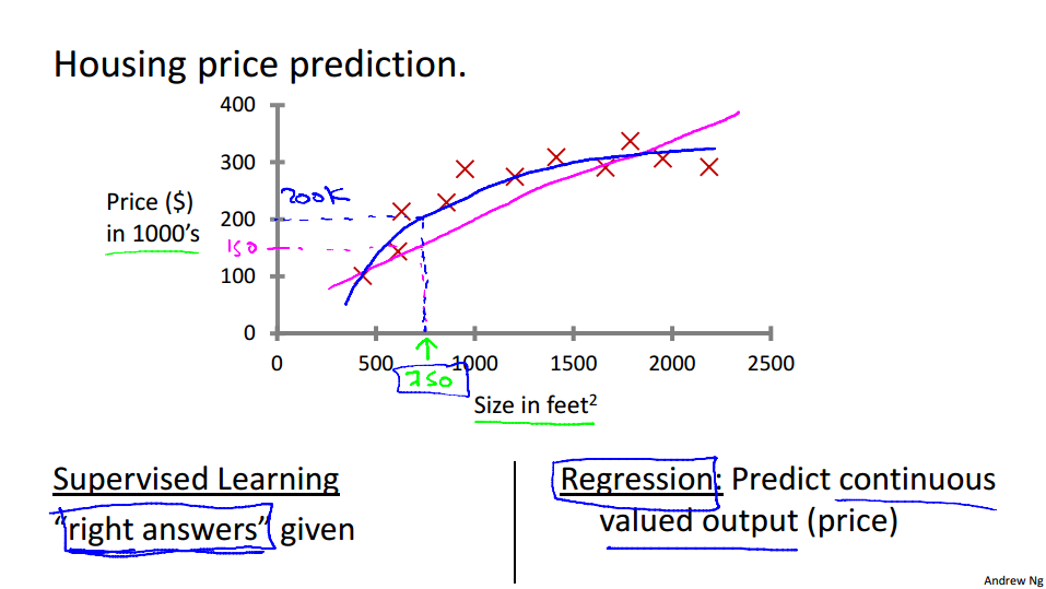 房价预测训练集中,同时给出了输入 $x$ 和输出结果 $y$,即给出了人为标注的**”正确结果“**,且预测的量是连续的,属于监督学习中的回归问题。