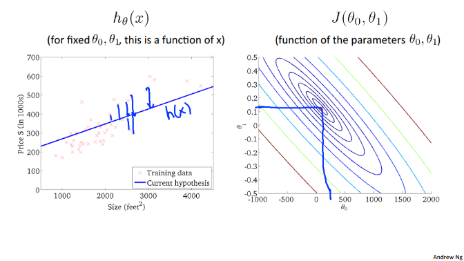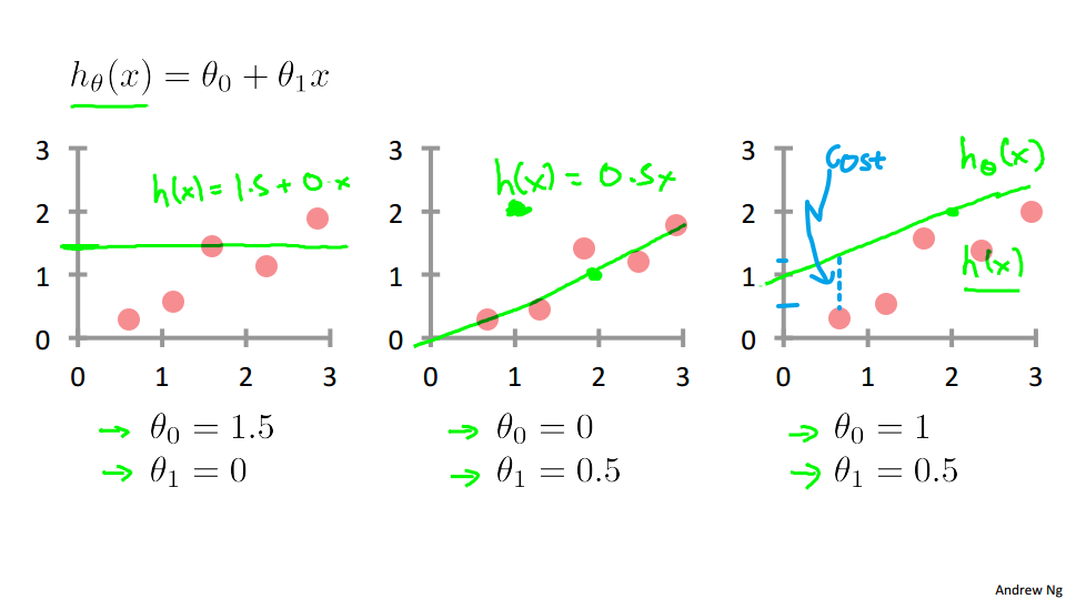 上图展示了当 $\theta$ 取不同值时,$h_\theta\left(x\right)$ 对数据集的拟合情况,蓝色虚线部分代表建模误差(预测结果与实际结果之间的误差),我们的目标就是最小化所有误差之和。