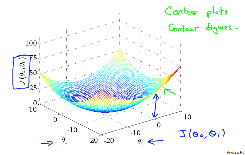 由于3-D图形不便于标注,所以将3-D图形转换为轮廓图(contour plot),下面用轮廓图(下图中的右图)来作直观理解,其中相同颜色的一个圈代表着同一高度(同一 $J\left(\theta\right)$ 值)。