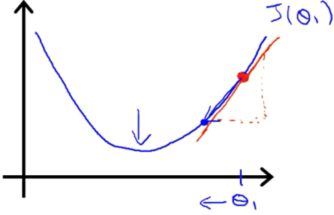 把红点定为初始点,切于初始点的红色直线的斜率,表示了函数 $J\left(\theta\right)$ 在初始点处有正斜率,也就是说它有正导数,则根据梯度下降公式 ,${{\theta }{j}}:={{\theta }{j}}-\alpha \frac{\partial }{\partial {{\theta }_{j}}}J\left( \theta_0, \theta_1 \right)$ 右边的结果是一个正值,即 $\theta_1$ 会向左边移动。这样不断重复,直到收敛(达到局部最小值,即斜率为0)。