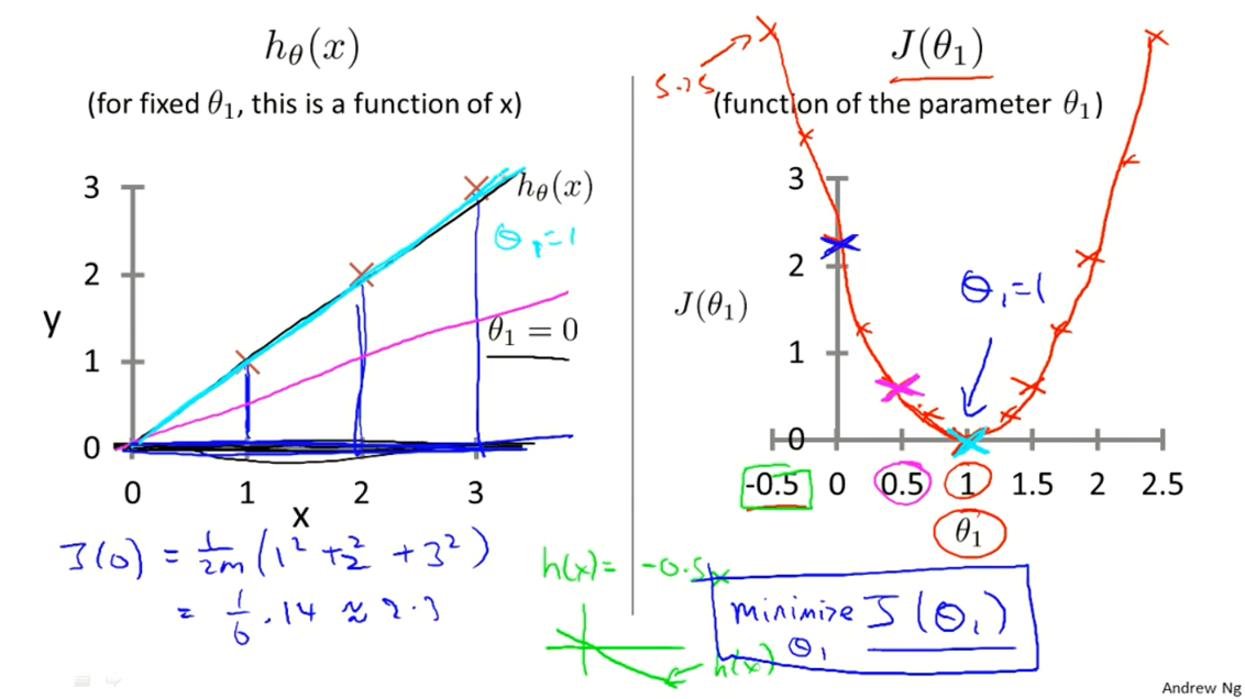 右图 $J\left(\theta_0, \theta_1\right)$ 随着 $\theta_1$ 的变化而变化,可见**当 $\theta_1 = 1$ 时,$J\left(\theta_0, \theta_1 \right) = 0$,取得最小值,**对应于左图青色直线,即函数 $h$ 拟合程度最好的情况。