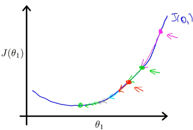 把红点定为初始点,切于初始点的红色直线的斜率,表示了函数 $J\left(\theta\right)$ 在初始点处有正斜率,也就是说它有正导数,则根据梯度下降公式 ,${{\theta }{j}}:={{\theta }{j}}-\alpha \frac{\partial }{\partial {{\theta }_{j}}}J\left( \theta_0, \theta_1 \right)$ 右边的结果是一个正值,即 $\theta_1$ 会向左边移动。这样不断重复,直到收敛(达到局部最小值,即斜率为0)。