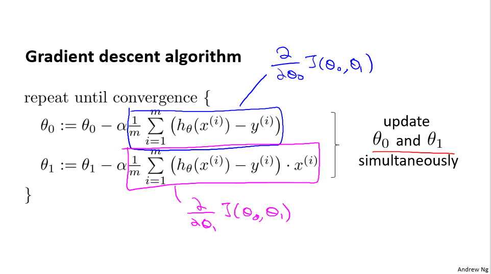 $\begin{align*} & \text{repeat until convergence:} ; \lbrace \newline ; &{{\theta }{j}}:={{\theta }{j}}-\alpha \frac{\partial }{\partial {{\theta }{j}}}J\left( {\theta{0}},{\theta_{1}} \right) \newline \rbrace \end{align*}$