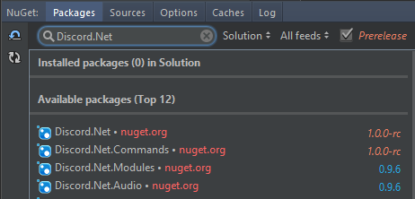 In the "Packages" tab, search for Discord.Net